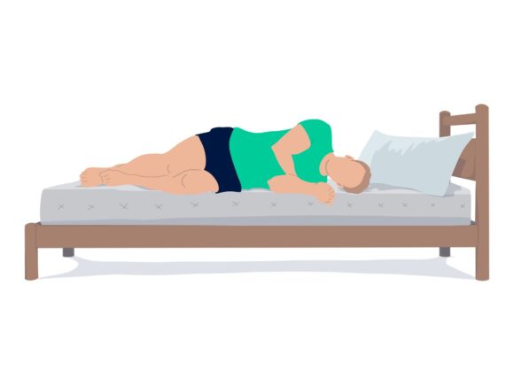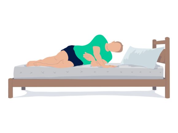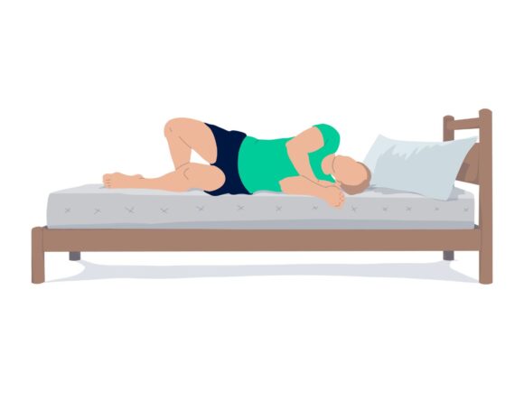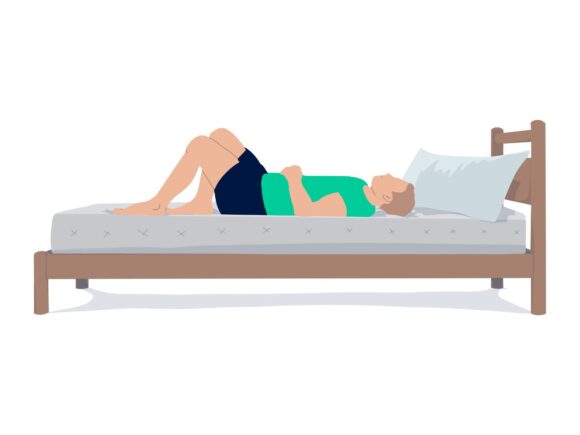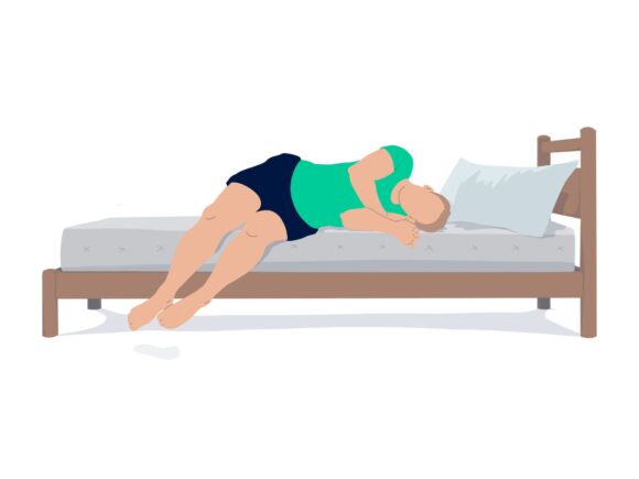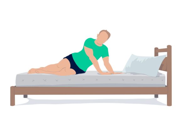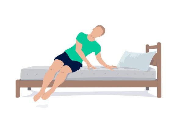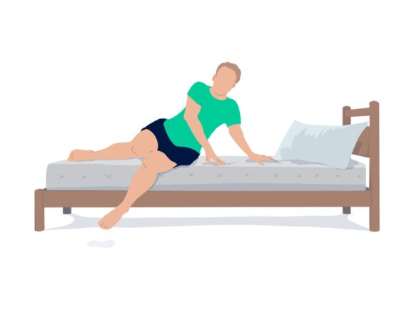 Sarah: Slowly lower yourself onto the bed until your head is fully supported on the bed or pillow and you’re lying on your side. Making sure the head remains supported, roll over onto your back and find a comfortable position. Keep your shoulders and hips in line as you roll over.